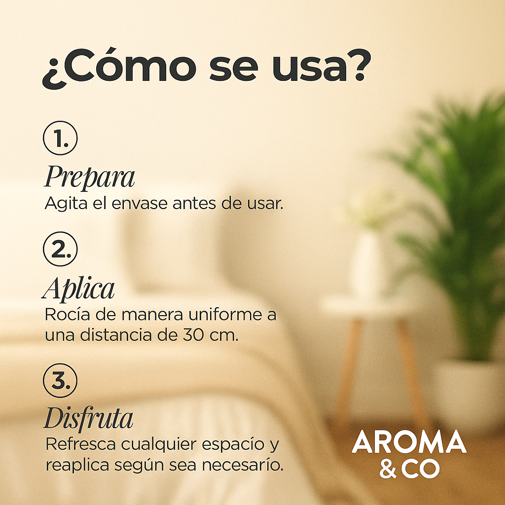 Los home sprays de Aroma & Co. son aromatizantes de lujo inspirados en fragancias exclusivas. Ideales para usar en la recámara, el carro o cualquier ambiente, ofrecen una experiencia sofisticada que transforma y eleva cada espacio con elegancia.